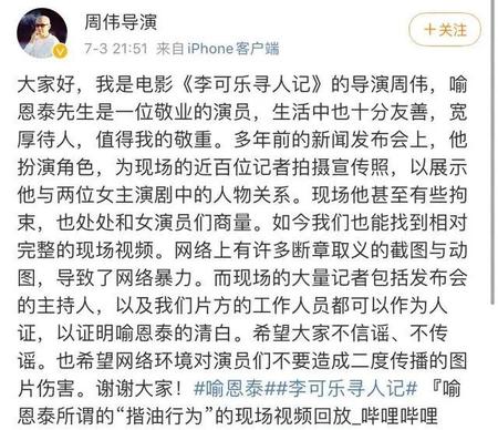 4.导演的力挺。导演微博晒出的微博表示,录制的排练的视频都有,喻恩泰在有过界行为时会问女演员,会商量可不可以这样,或者那样行不行。声音回放都有,都可以对质。有证据的情况下,想诬陷人都不行。