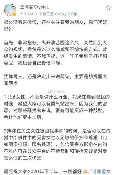 3.女演员的回应。王澜霏发表回应,通篇文章写的是女演员保护好自己,职场如何如何,闭口不提喻恩泰。如果你被携油,指名道姓的说出来,女演员没有提无非炒作自己,还特意说自己离开演员这行业很久了。那你离开的时候怎么不说现在说?你的生活怎么样不得而知,会不会炒作自己好付出吸金,目的不纯。