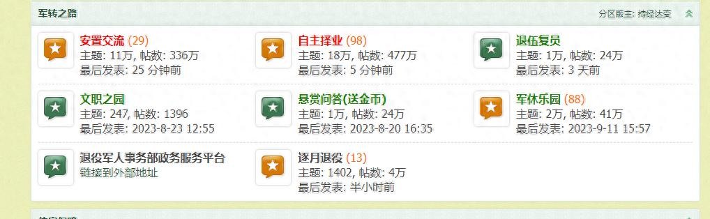 感觉自主和军退年龄大,可能空闲时间多,尤其是退休的人员,更多的是互相在交流生活感悟和互相勉励。逐月和文职作为新事物,还是有很多不懂的在互相询问和交流。安置的只要是待安置期间上网咨询的多。