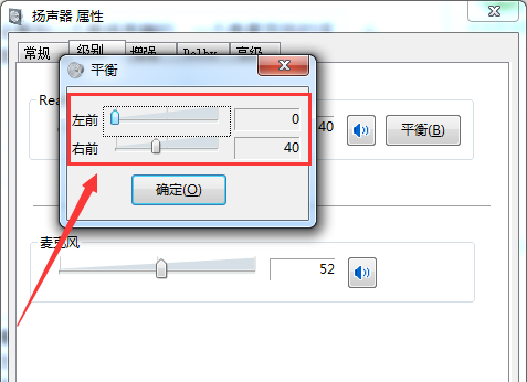 3、在小窗口里,把左前或右前调到0(只能把一个调到0),也就是拉到最左边,然后点“确定”即可。