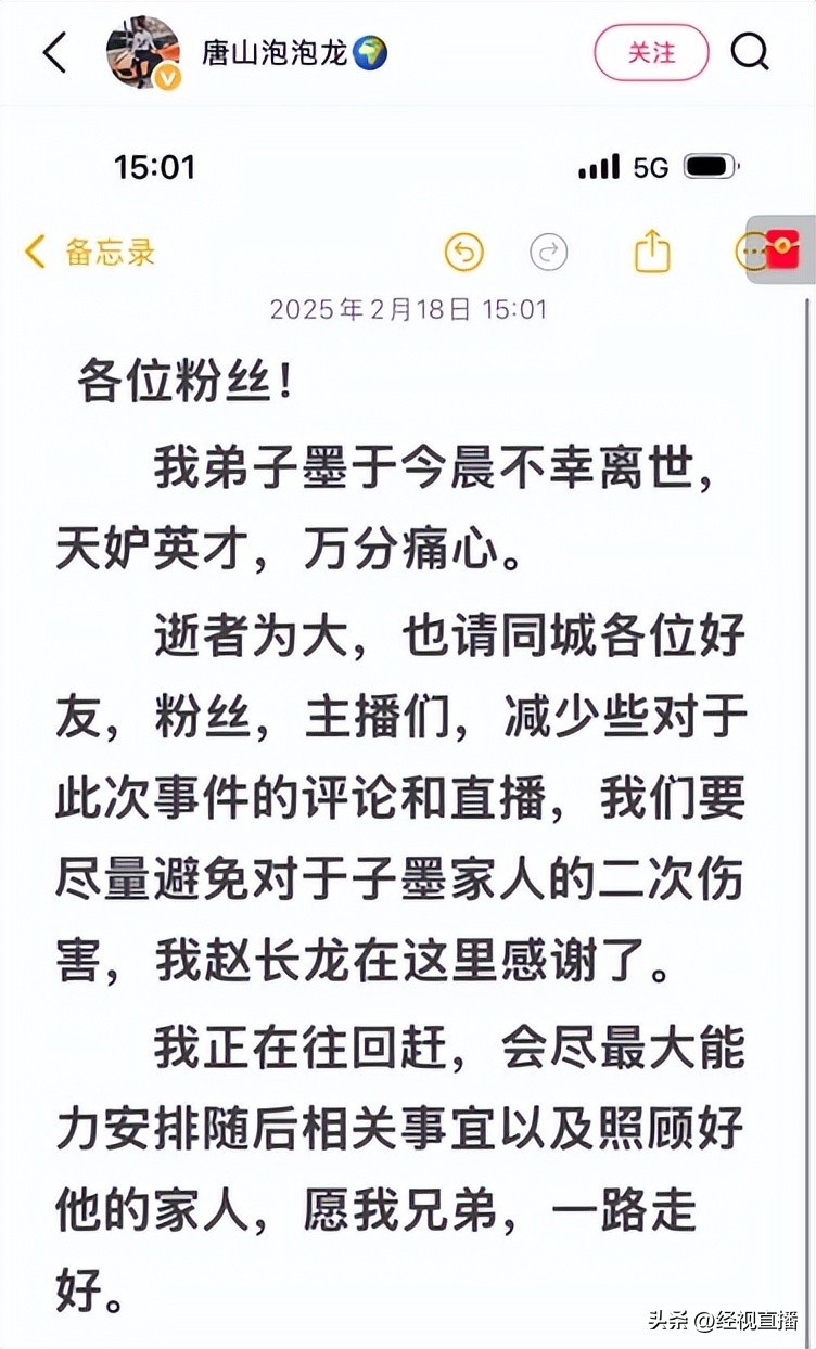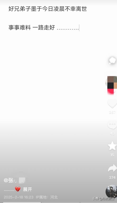 18日下午,记者搜索发现,一位河北唐山拥有16万抖音粉丝的网红“张小伙”发视频称,好兄弟子墨于今日凌晨不幸离世,世事难料,一路走好。另外一位拥有1361万快手粉丝的网红也发文证实,王子墨今晨不幸离世,万分痛心。还有一位知情网友向记者证实,王子墨昨天还在直播,今日凌晨5点出车祸不幸离世。