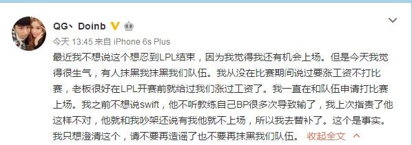 Doinb微博被韩国队友针对,微博大吐苦水,swift队霸如此可恨?