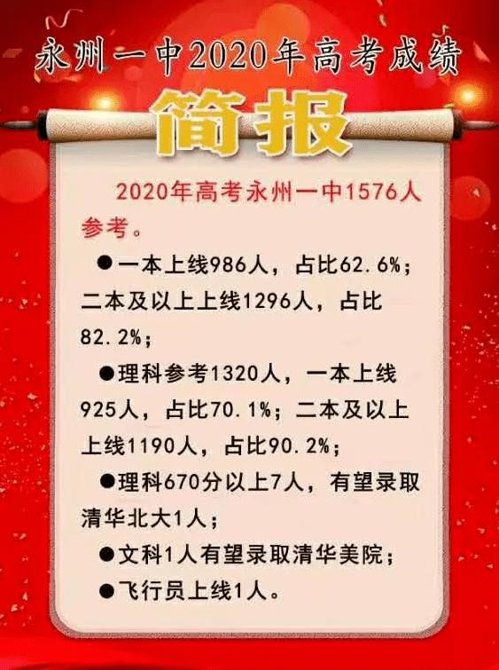 2020年高考中,永州一中再创佳绩,一本上线986人,占比62.6%,理科670分以上7人。