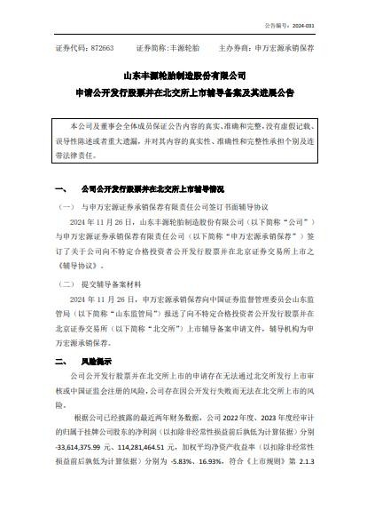 11月28日,山东丰源轮胎制造股份有限公司(以下简称“丰源轮胎”)发布申请公开发行股票并在北交所上市辅导备案及其进展公告。