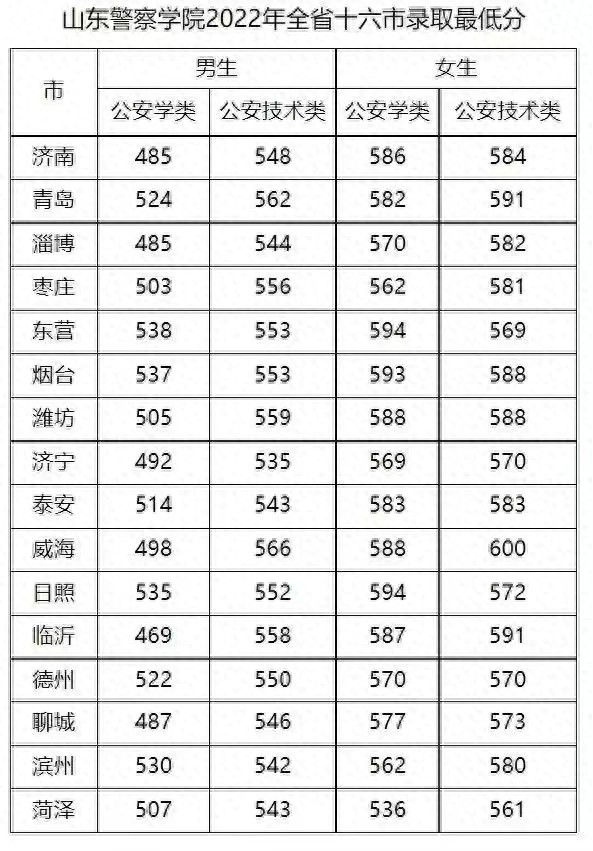 山东警察学院2022年高考在山东省十六地市录取最低分数线
