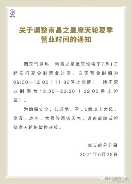 提醒 【别弄错了!南昌之星摩天轮营业时间有变 】因天气炎热,南昌之星摩天轮将于7月1日起实行夏令时营业时间,白天营业时间为09:00——12:00(11:30停止检票),晚间营业时间为18:00——22:30(22:00停止检票)。