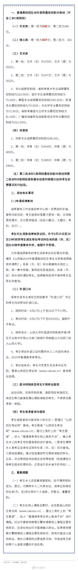 中新网6月24日电 据山西招生考试网消息,6月24日,山西省2019年普通高校招生本科录取最低控制分数线(不含二批本科C类院校)公布,其中,文史类:第一批为542分;第二批为481分。理工类:第一批为507分;第二批为 432分。