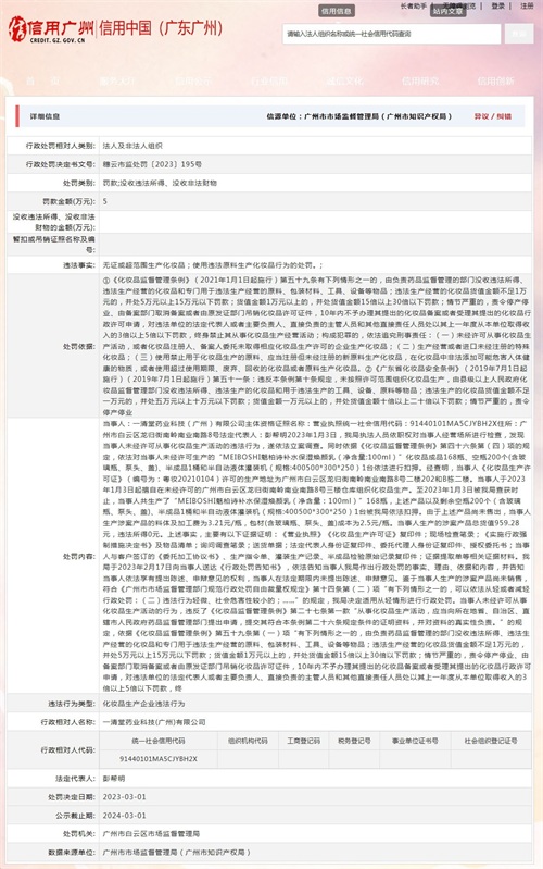 中国质量新闻网讯 近日从信用中国(广东广州)网站获悉,广州市白云区市场监督管理局对一清堂药业科技(广州)有限公司处以罚款5万元。行政处罚决定书文号: 穗云市监处罚〔2023〕195号。