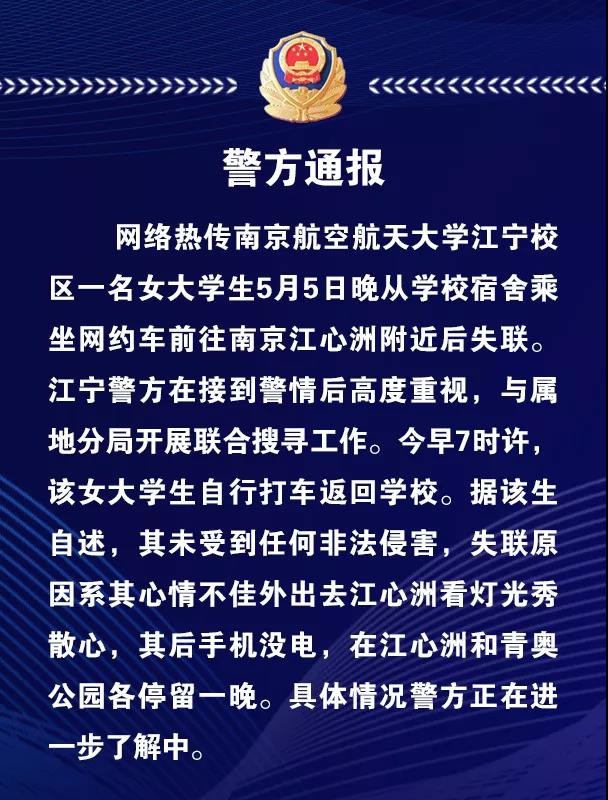 警方通报南航女生失联:未受不法侵害,2公园各停留一晚 2025-12-26 04:11 点击: 来源:蝉貂网 摘要:警方通报南航女生失联:未受不法侵害,2公园各停留一晚 新京报快讯 7日,南京江宁警方在其官方微信通报南京航空航天大学女大学生乘坐网约车失联事件,以下为关于此事通报全文: 警方通报南航女生失联:未受不法侵害,2公园各停留一晚新京报快讯 7日,南京江宁警方在其官方微信通报南京航空航天大学女大学生乘坐网约车失联事件,以下为关于此事通报全文:编辑 倪艳楠 相关标签: 上一篇:蚌埠医学院将更名蚌埠医科大学 下一篇:人类月球日丨月球冷知识知多少?