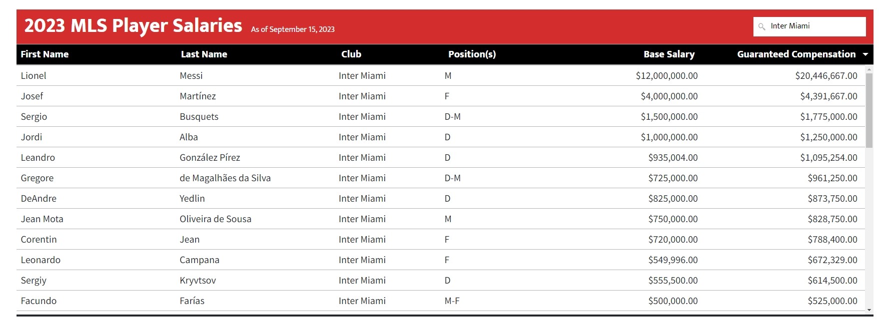 直播吧10月23日讯 据此前MLS官方发布2024年球员薪资指南,梅西的基本工资(12000000美元)、保障薪酬(20446667美元)均占据美职联第一。