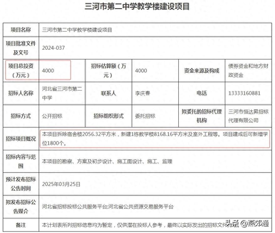 河北省招标投标公共服务平台发布“三河市第二中学教学楼建设项目”招标计划公告。