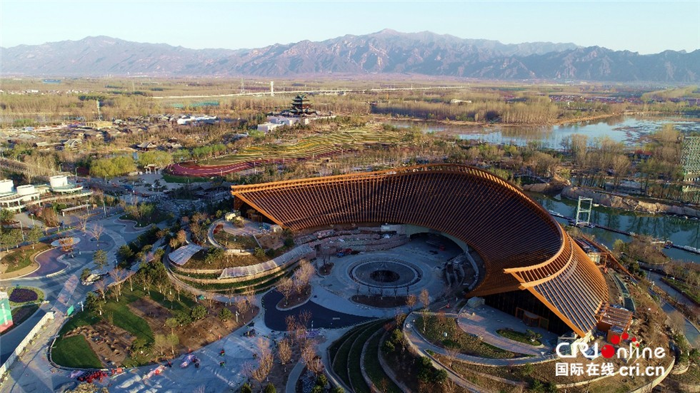 从空中俯瞰北京世园会中国馆,舒展优美的曲线屋顶,仿佛一柄精美的金色如意居于自然山水之间。 北京世园会供图