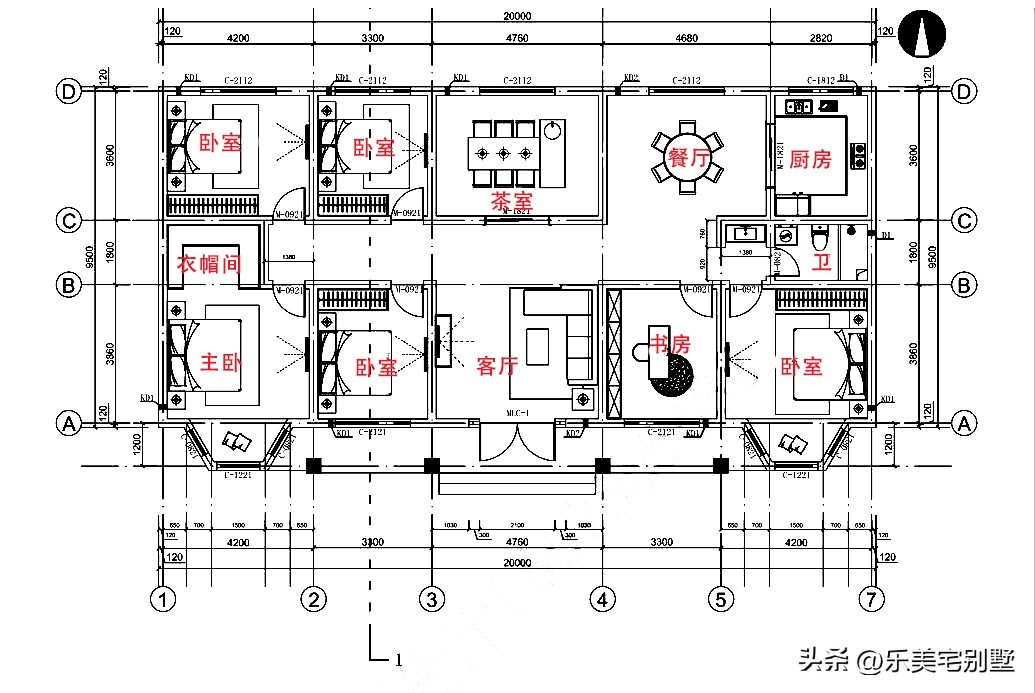 一层:客厅、茶室、餐厅、厨房、主卧(带衣帽间)、4间次卧、书房、卫生间