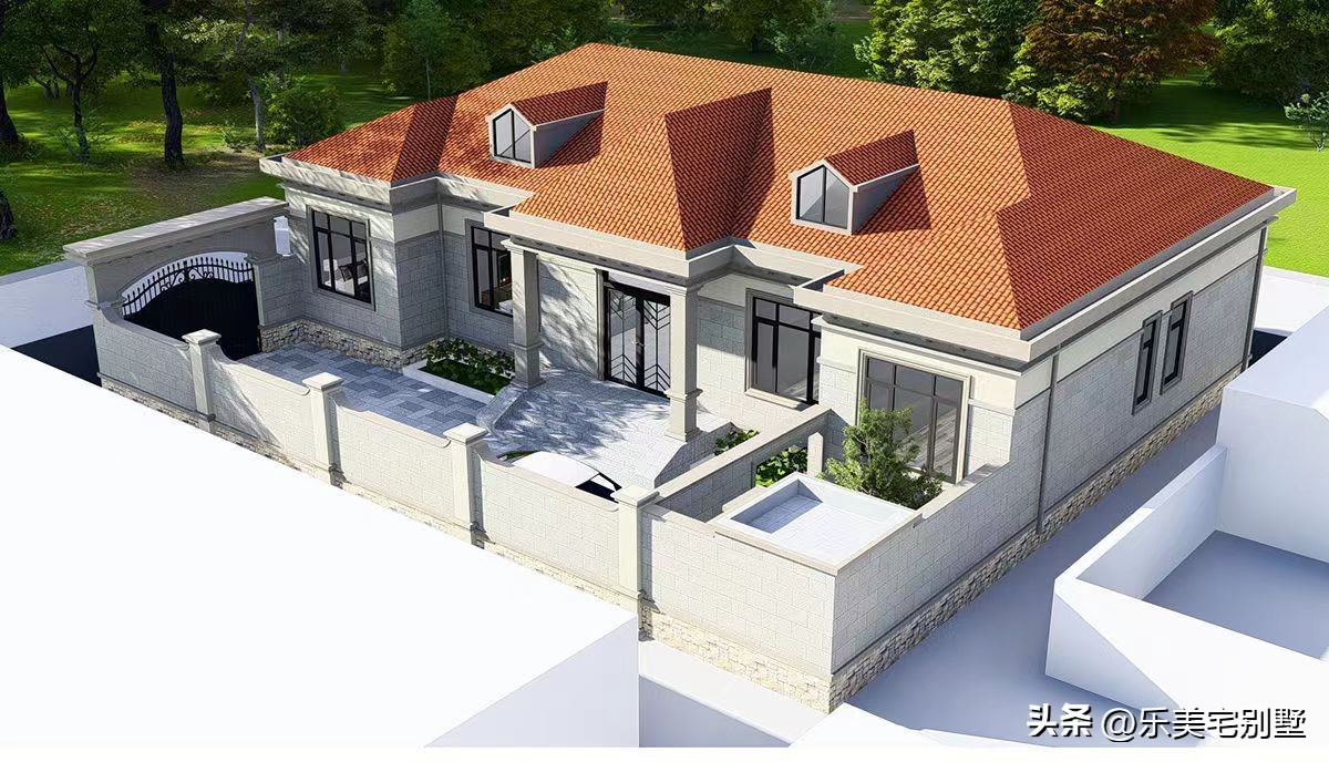欧式风格设计,造型简约大方,外观配色和谐,院子功能分区合理,非常适合农村养老别墅。