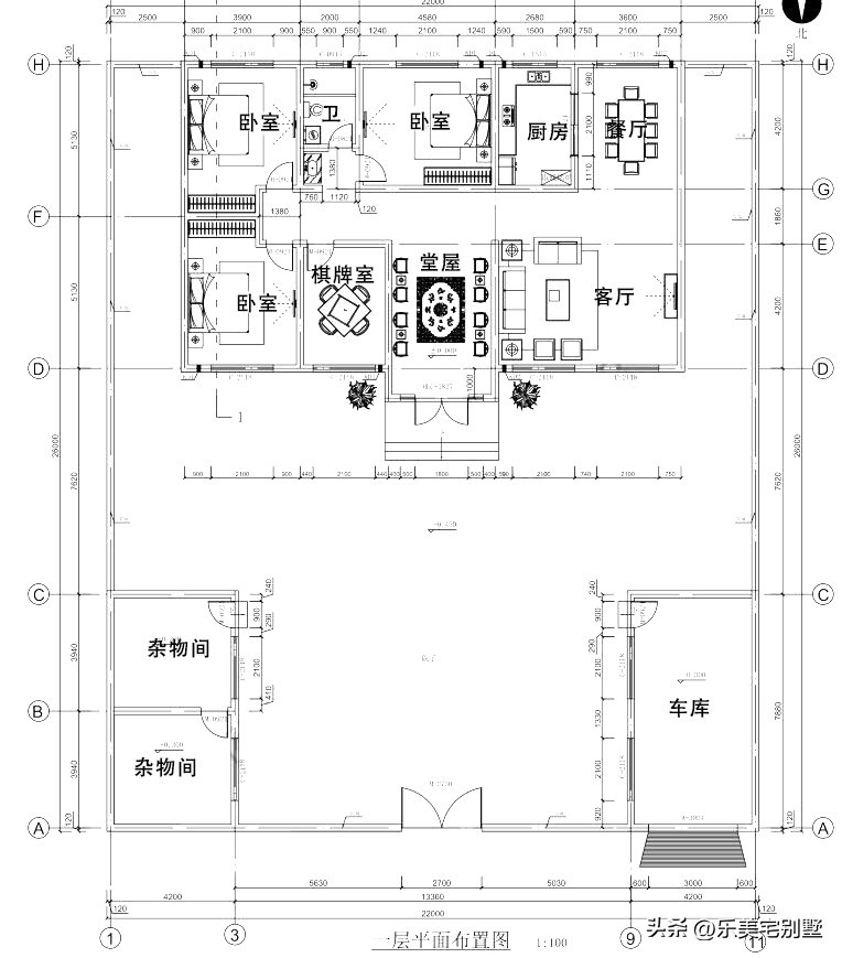 一层:堂屋、棋牌室、客厅、餐厅、厨房、3卧室、卫生间、车库、2杂物间