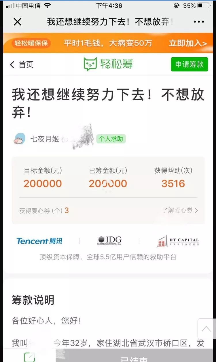 申请者在发起筹款时,应尽可能提供更全面、详细的个人病情及经济情况,以便佐证申请人所言情况。