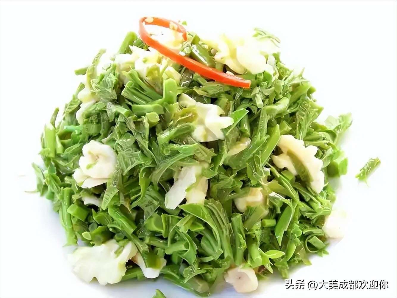 核桃花拌香椿:原料有核桃花、香椿苗、红辣椒,调料有盐、味精、香油、鸡精。制作时先将核桃花放温水中涨发、洗净,香椿苗去根洗净,红辣椒去蒂、籽洗净切丝,再分别将核桃花、香椿苗、辣椒丝放沸水中焯一下,然后加入调料拌匀。