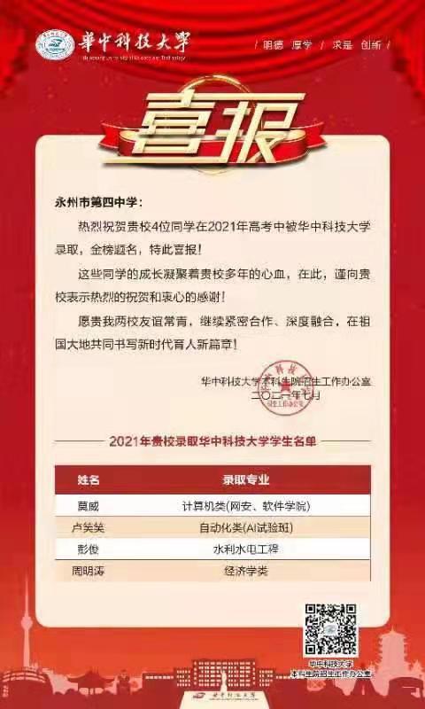 华中科技大学向永州四中发来喜报